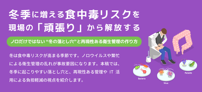 本稿では、冬季に起こりやすい食中毒の“落とし穴”を整理しつつ、食品工場が「気をつけましょう」「ちゃんとやりましょう」から一歩進み、再現性を持って回せる衛生管理へ移行するための視点をまとめます。あわせて、IT活用を「監視」ではなく「現場と管理者の負担を減らすための仕組み」として捉える考え方も紹介します。