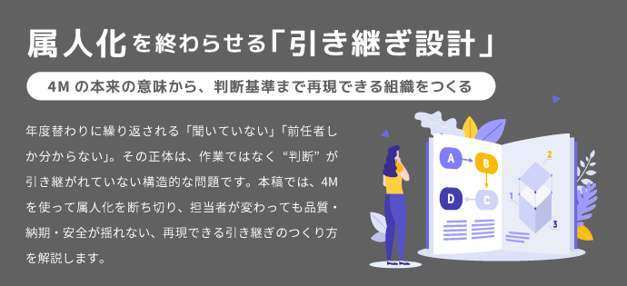 引き継ぎとは、本来「作業のバトンタッチ」ではありません。担当者が変わっても、品質・納期・安全・利益が同じように出続ける状態をつくる行為です。本稿では、その設計の土台として4Mを正しく説明し、その上で引き継ぎにどう応用すれば「判断基準まで再現できる」ようになるかを、具体例とともに整理します。