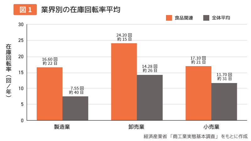 食品業界は全体平均よりも高い回転率を示しており、特に卸売業では24回と突出しています。